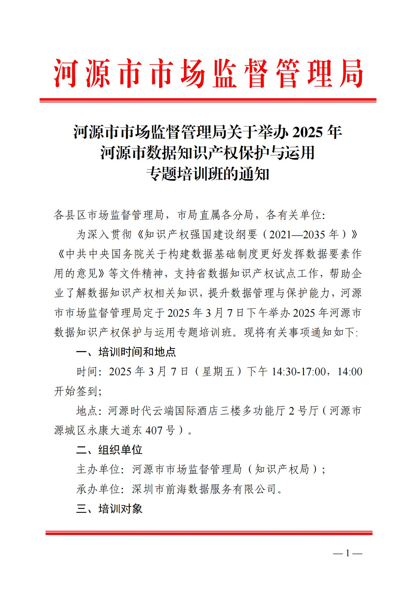 河源市市场监督管理局关于举办 2025 年河源市数据知识产权保护与运用专题培训班的通知
